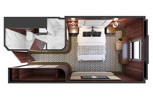 Located: Deck 6 Occupancy: Up to 3 guests 300 sq. ft. of total living space with floor to ceiling top-drop Juliet balcony and interior sitting area with convertible sofa Queen bed (convertible to two single beds) Elegant private bath featuring L'Occitane products, a walk-in glass shower with rain head, body jets and a handheld shower, a walk-in closet and wardrobe All include a flat-screen TV with state-of-the-art "infotainment" system