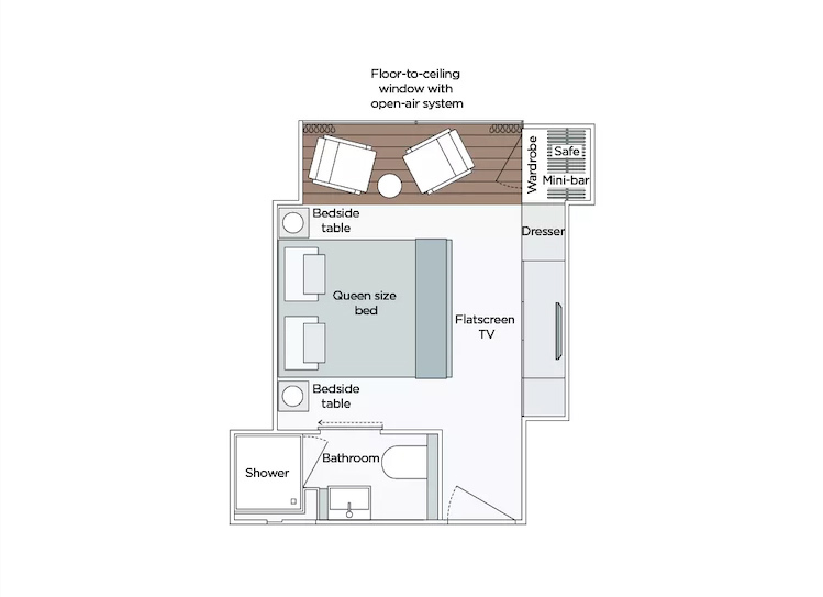 An Emerald Stateroom is home to all the amenities you need to settle into your home-away-from-home. A great size picture window lets in the perfect amount of light, welcoming in the golden summer sunshine, or the winter sun during cooler months. Comfort is of the highest importance, so each room features individual climate control, allowing you to personalise your room’s temperature to suit your preferences and the time of year you’re cruising.We’ve designed our bathrooms as a relaxing retreat to retire to after an exciting day exploring. Enjoy a sumptuous shower complete with indulgent toiletries, as well as a hairdryer, all before settling into your queen or twin hotel-style bed, complete with luscious linens, as you enjoy a movie on your flat screen TV and infotainment system with, perhaps, a nightcap from your mini-bar. If you wish to stay in contact with loved ones throughout your trip, you can do so using your in-suite telephone or our free Wi-Fi available throughout the ship.